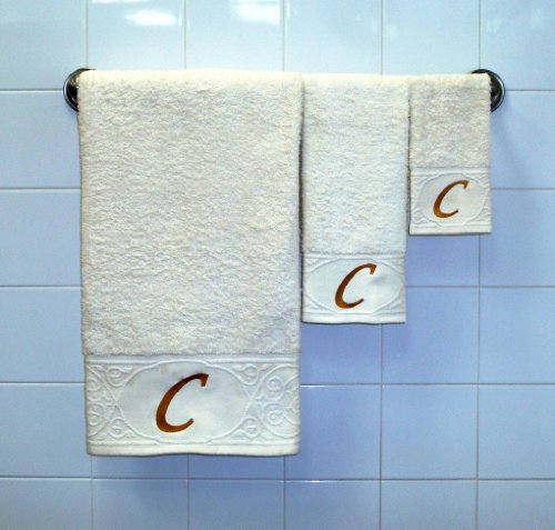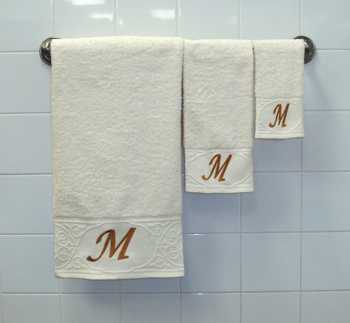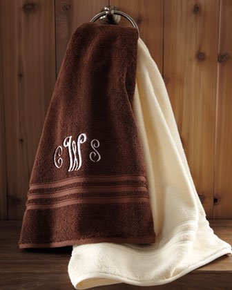 - Monogram screened in turquoise ink on white - lattice motif. (blue background for display purposes only; towels are white)