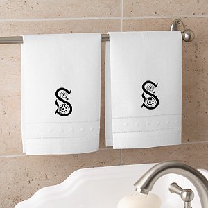 From the guest bath to the kitchen, our exclusive Initially Yours© Linen Towels are a sophisticated addition to your home.The calligraphy monogram style features bold artistic lines, softened by delicate curvilinear depictions of leaves and flowers. See full alphabet below main image.Select any single initial monogram and we will skillfully imprint the design on your choice of white or ecru linen towels. Monogram is imprinted in your choice of 8 imprint colors. Set of two white or ecru linen towels are hem-stitched with embroidered dot detail. Towels are 55% linen, 45% cotton. Machine wash/dry. Each measures 14" x 22". A lovely and impressive housewarming gift as well.
